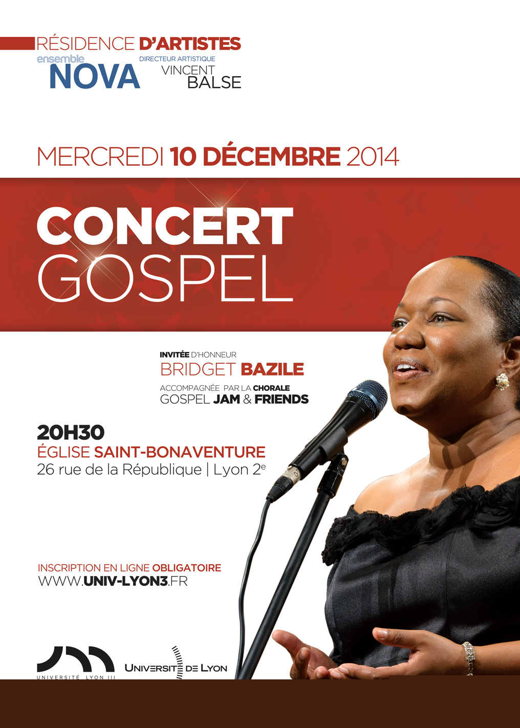 Pour cette occasion, Bridget Bazile sera entourée des choristes du ch?ur Gospel Jam and Friends et des musiciens de l’Ensemble Nova, en résidence d'artistes à Lyon 3, dirigé par Vincent Balse.
