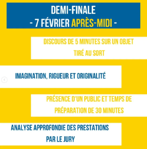 Venez assister à la demi-finale d'Imp(r)ose-Ton-?loquence ! 8 orateurs sélectionnés le matin même passeront devant un jury sur des sujets des plus spéciaux, dans l'espoir de se qualifier pour la grande finale improvisée du 26/02 à 18h. Pour cette épreuve, les sélectionnés n'auront que 30 minutes pour préparer leur discours, le soutien du public leur sera essentiel ! La demi-finale se tiendra au sein de l'Amphithé?tre Huvelin.